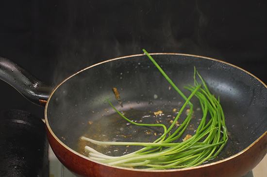 3、洗净的香葱均匀铺在锅底,一面用余油煎出香味后,翻面再煎片刻。
