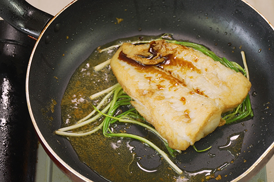 4、最后将龙利鱼摆在香葱上面,淋入适量生抽,加入清水煮开后大火收汁至浓稠,美味的葱油龙利鱼就做好了。
