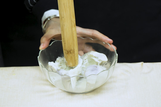 2、芋头放入大碗内捣成泥状,再调入盐、白糖、胡椒粉搅拌均匀。