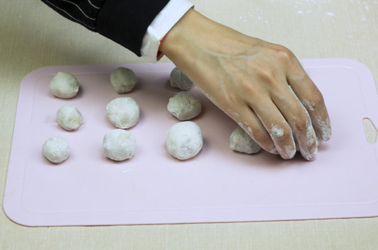 3、芋泥放凉后依次加入红薯粉搅拌均匀后,揉搓成光滑不粘手的面团,充分揉匀后静置一段时间,再将面团揪成若干个芋圆。