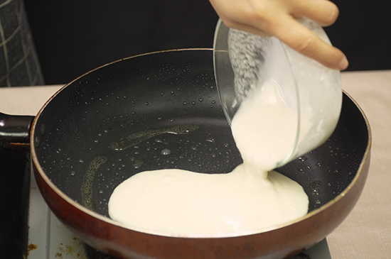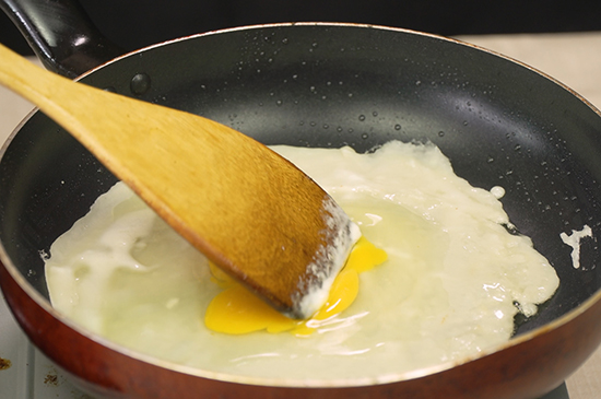 2、往锅内刷一层油,将面糊抹匀在锅内,同时打入鸡蛋摊平中火慢煎。
