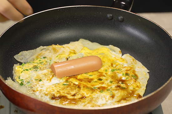 将面糊抹匀在刷好油的锅内,同时打入鸡蛋摊平中火慢煎。再往锅内撒上葱花和芝麻,面糊和蛋液凝固后翻面煎制,之后再次翻面,表面刷适量甜面酱并依次放上火腿肠、生菜,最后用铲子铲起卷成卷,美味的手抓饼就完成了。