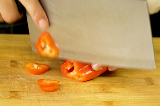 1、豆角洗净后摘成小段,蒜一半掰成瓣、一半剁泥,红椒切辣椒圈备用。