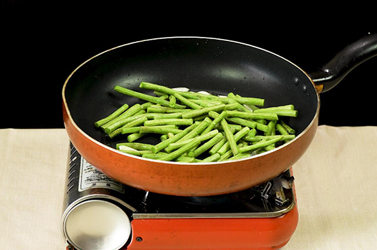 2、起锅烧油,油热后放入蒜片炒出香味,再加入豆角炒至变色。