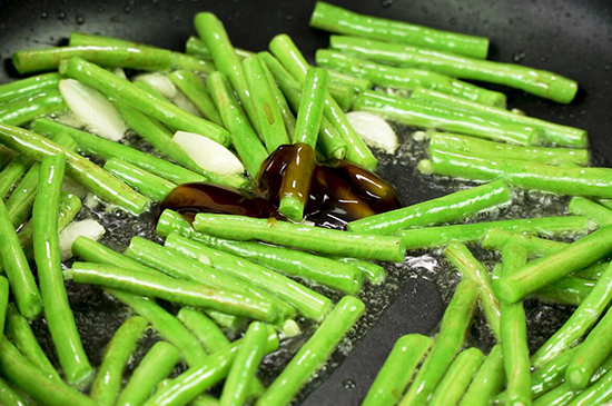 起锅烧油放入蒜片炒出香味后,加入豆角炒至变色,再往锅内依次加入适量蚝油和豆瓣酱、老抽翻炒均匀,最后加入精盐调味,放入蒜泥和红椒翻炒几下就可以装盘,美味的酱焖豆角就完成了。