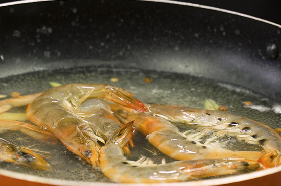 3、往锅内放入洗净的虾煮制,直到虾颜色变红即将熟透。
