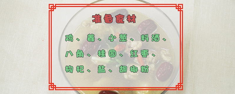 准备食材:鸡、姜、小葱、料酒、八角、桂圆、红枣、枸杞、盐、胡椒粉。