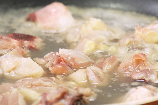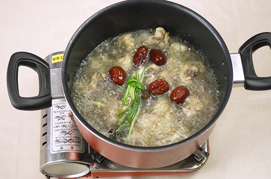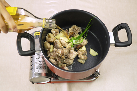 3、鸡块、葱结、姜片、八角、料酒、胡椒粉和水倒入干净锅内,大火煮沸后撇去浮沫,再转小火炖煮1小时左右。