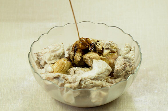 2、煮好的排骨用料酒、生抽、老抽和香醋腌制20分钟左右。