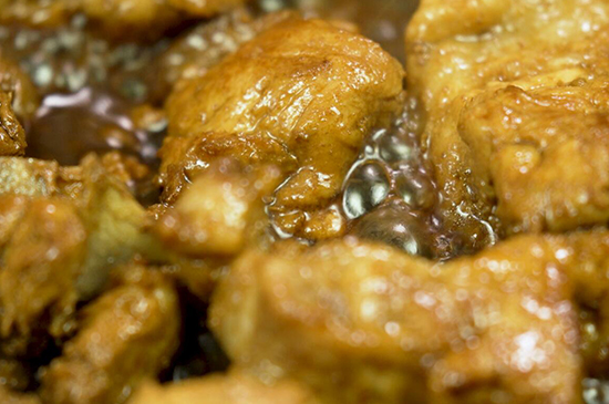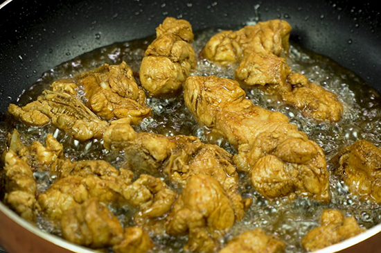 3、起锅烧油,油热后放入排骨炸至金黄色,再倒入腌排骨的汁、白糖和煮排骨的肉汤大火烧开。