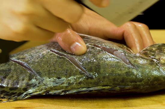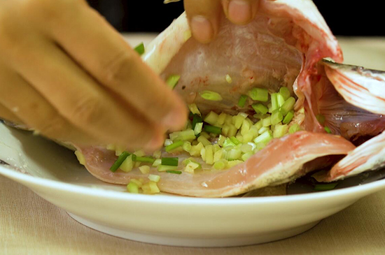 1、桂鱼处理干净后凉面切十字花刀,姜切末,蒜切末,葱白切末备用。