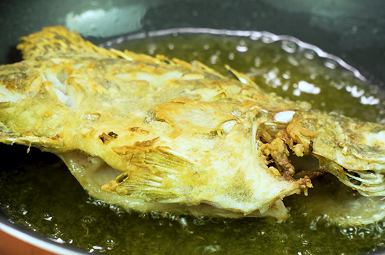 3、起锅烧油,油热后放入裹好面粉的鱼中小火炸至两面金黄,再盛出备用。