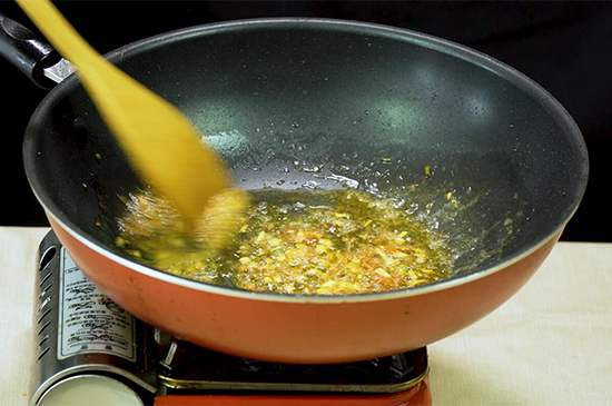 4、往锅内放入葱姜蒜末炒出香味后,倒入番茄酱和白糖炒香,再加入柠檬汁和白醋翻炒。
