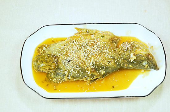 5、加入清水和适量盐,再把煎好的鱼放入小火熬煮,不断用勺子舀起汤汁浇在鱼身上,汤汁变浓稠后即可装盘,最后撒上白芝麻,美味的糖醋鱼就做好了。