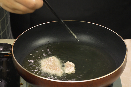 3、起锅烧油,油热后放入裹好淀粉的肉片炸至金黄色,再捞出控油装盘。