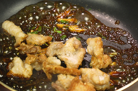 4、往锅内倒入调好的汁和水淀粉小火熬至粘稠,再放入葱花和姜丝,最后放入肉片翻炒30秒左右,一份美味的锅包肉就做好了。