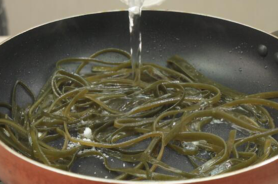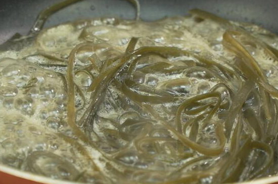 起锅烧油放入蒜片炒出香味后,将切好的海带放入翻炒,再依次倒入适量料酒、生抽、糖和水,盖锅煮制一段时间。汤汁快煮干时,撒上葱花和味精翻炒均匀,一份美味的红烧海带就完成了。