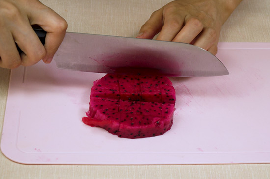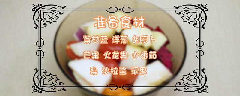 1、紫甘蓝切丝,芒果划十字刀取出果肉,小番茄对半切开,火龙果切块,梨去皮切块,苹果去皮切块,洋葱切片,胡萝卜切小块备用。