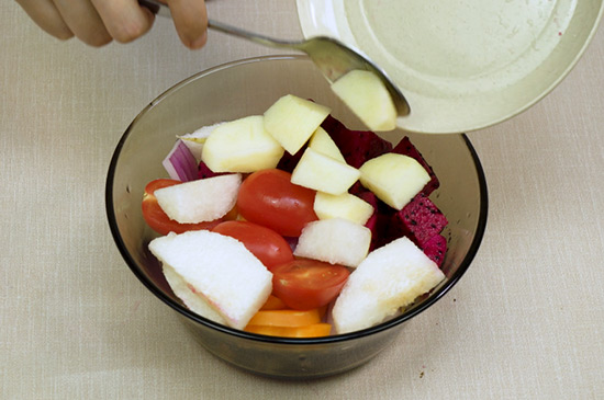 2、切好的芒果、洋葱、胡萝卜、小番茄、火龙果、梨和苹果放在一起搅拌块均匀。