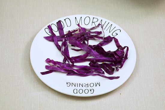 3、紫甘蓝丝放入盘底,再把搅拌好的果蔬倒在上面。