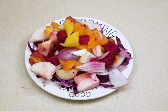 切好的芒果、小番茄、洋葱、胡萝卜、火龙果、梨和苹果放在一起搅拌块均匀后,放在紫甘蓝丝铺底的盘子内,最后淋上沙拉酱,这样一份美味的蔬菜沙拉就完成了。