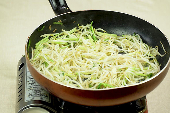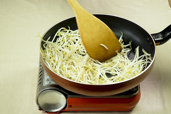 2、起锅烧热,不倒油干炒至豆芽软塌,再盛出装盘备用。
