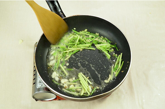 3、起锅烧油,油热后先放胡椒粉、鸡精翻炒,再加入切好的葱蒜、芹菜炒出香味。