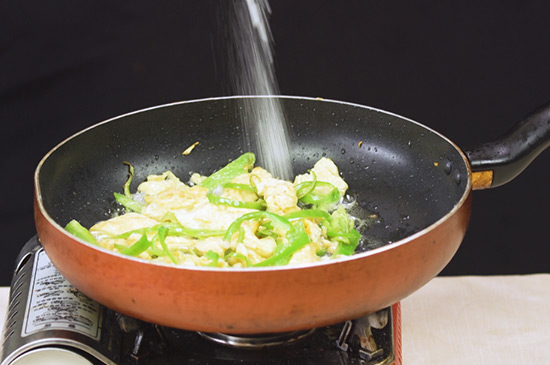 5、最后倒入煎好的鸡蛋块炒匀,加入适量的盐,一份美味的青椒炒鸡蛋就做好了。