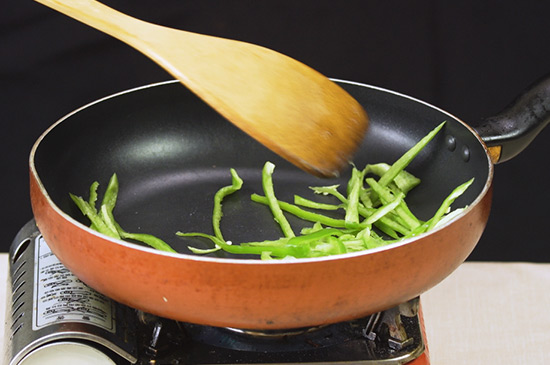 2、切好的辣椒直接放入锅内翻炒,直到水分被炒干再捞出盛好备用。