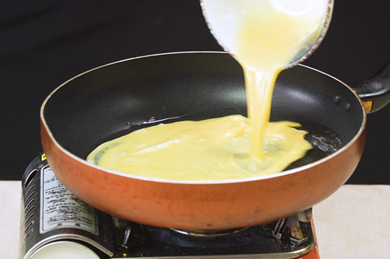 3、起锅烧油,油热后倒入鸡蛋液用锅铲略微搅动,直到蛋液成型再盛入碗内备用。