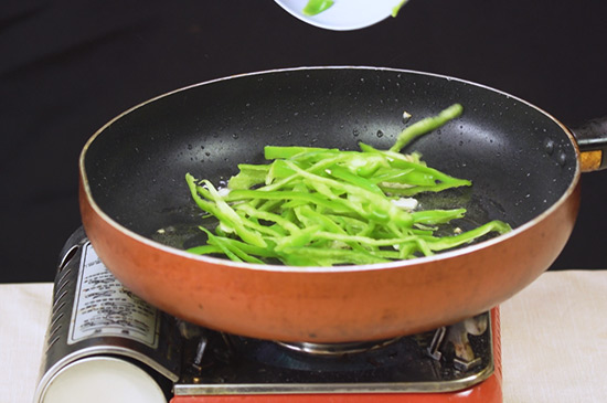 4、锅内加入少量油,放入切好的蒜炒出香味后,放入辣椒丝翻炒均匀。