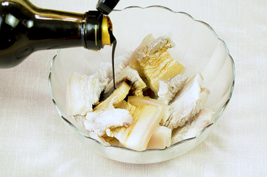 3、起锅烧油,油热后放入腌好的五花肉炸至肉皮金黄色气泡,再捞出放凉整齐码在盘内,同时把腌肉的汁淋在上面。