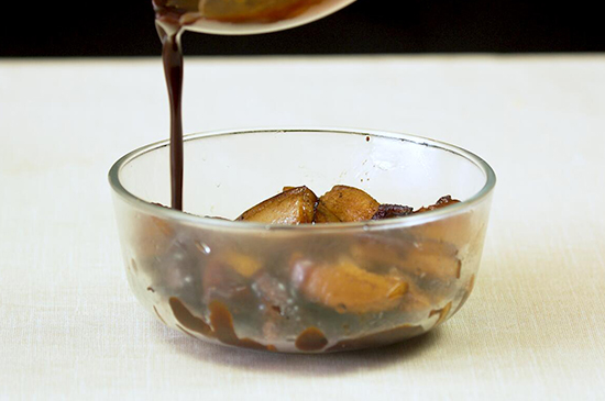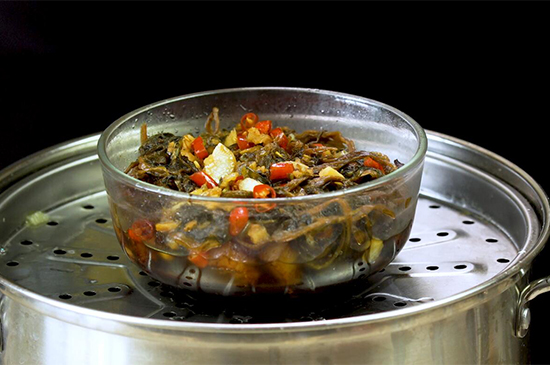 5、最后将炒好的梅干菜和汤汁倒在肉片上面,放入蒸锅内蒸1小时后倒扣在盘内,美味的扣肉就做好了。