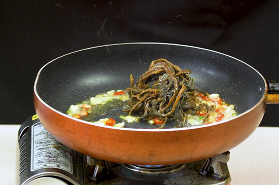 4、锅内再加适量油烧热,放入冰糖炒化后,加入切好的葱姜蒜和辣椒炒出香味,再放入梅干菜炒热。