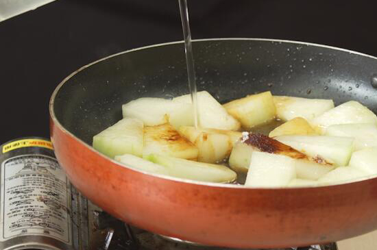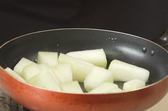 2、起锅烧油,油热后放入蒜炒出香味,再放入冬瓜煎至微黄。