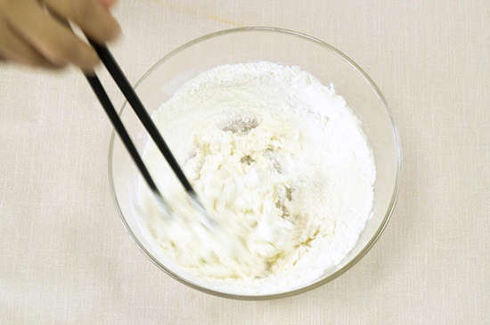 1、盐加水融化后,倒入面粉内用筷子搅成棉絮。