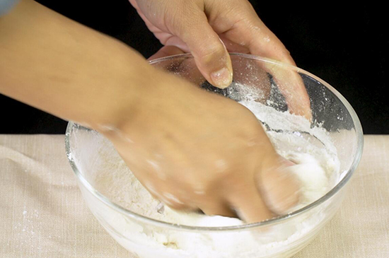 2、再用手不断揉捏面絮,直到揉成光滑的面团,再盖上湿布醒发15分钟左右。