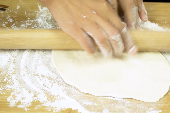 3、醒发后的面团再反复揉搓一遍,在案板上撒上干面粉后,用擀面杖将面团向四周擀开成薄片。