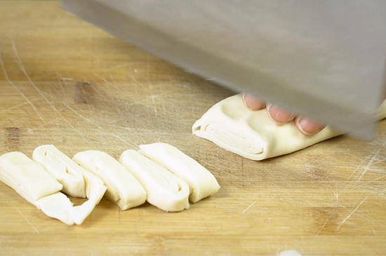 4、最后用刀将薄皮切成均匀的条状,撒上适量干面粉后,将面条抖开。