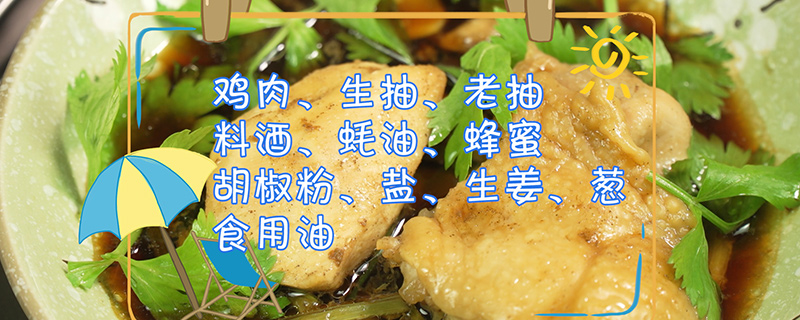 准备食材:鸡肉、生抽、老抽、料酒、蚝油、蜂蜜、胡椒粉、盐、生姜、葱、食用油