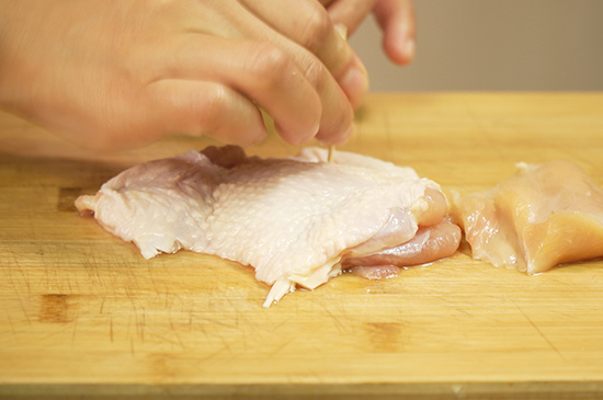 1、鸡肉清洗干净后,用牙签全身扎洞方便入味,生姜切片,葱切段备用。