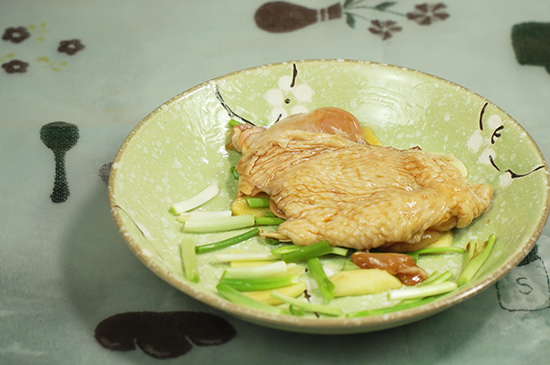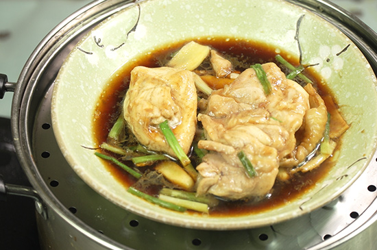 3、在盘内刷一层油,铺上姜片和葱段后,把鸡肉和酱汁放入盘内,之后放入蒸锅中。