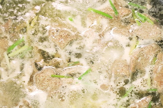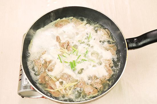 3、浸泡好后调至大火烧开捞出浮沫,再放入适量香菜、调和油、盐小火搅拌均匀。