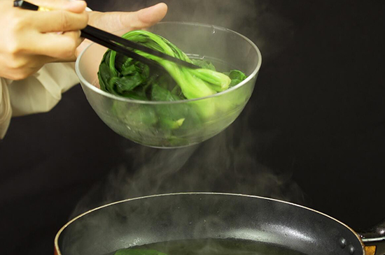 2、起锅烧水,水烧开后放入适量盐,再放入菠菜盖锅焯烫1分钟左右,再捞出沥干水分备用。