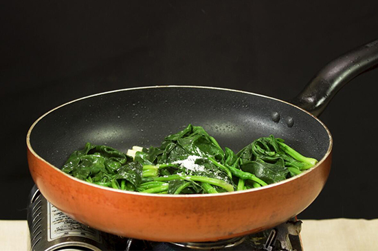 4、按照个人口味加入适量盐, 再用筷子翻拌均匀,小火翻拌10秒钟左右即可关火装盘,一份营养美味的清炒菠菜就做好了。