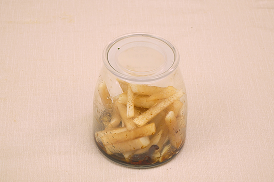 4、最后将容器密封,搁置一个晚上后,一份酸爽可口的萝卜干就做好了。
