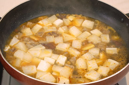 4、之后加入萝卜翻炒片刻,加入适量的盐,再加足够的水烧开,再转中小火熬煮30分钟,一份美味的牛肉炖萝卜就做好了。