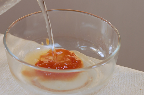3、适量番茄酱、糖、醋和清水搅匀调至成料汁,起锅烧热后倒入料汁煮至冒泡,再放入炸好的鸡胸肉翻炒均匀。