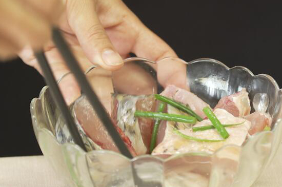 2、草鱼块和料酒、生抽、姜片、葱、盐搅拌均匀,再腌制15分钟左右。