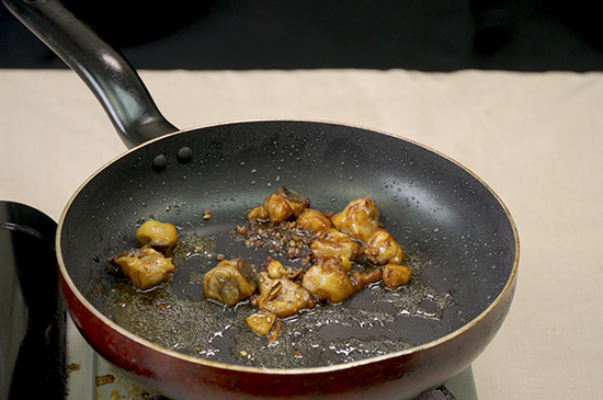 2、起锅烧油,油热后放入冰糖煮制融化变色,再加入鸡肉翻炒上色。